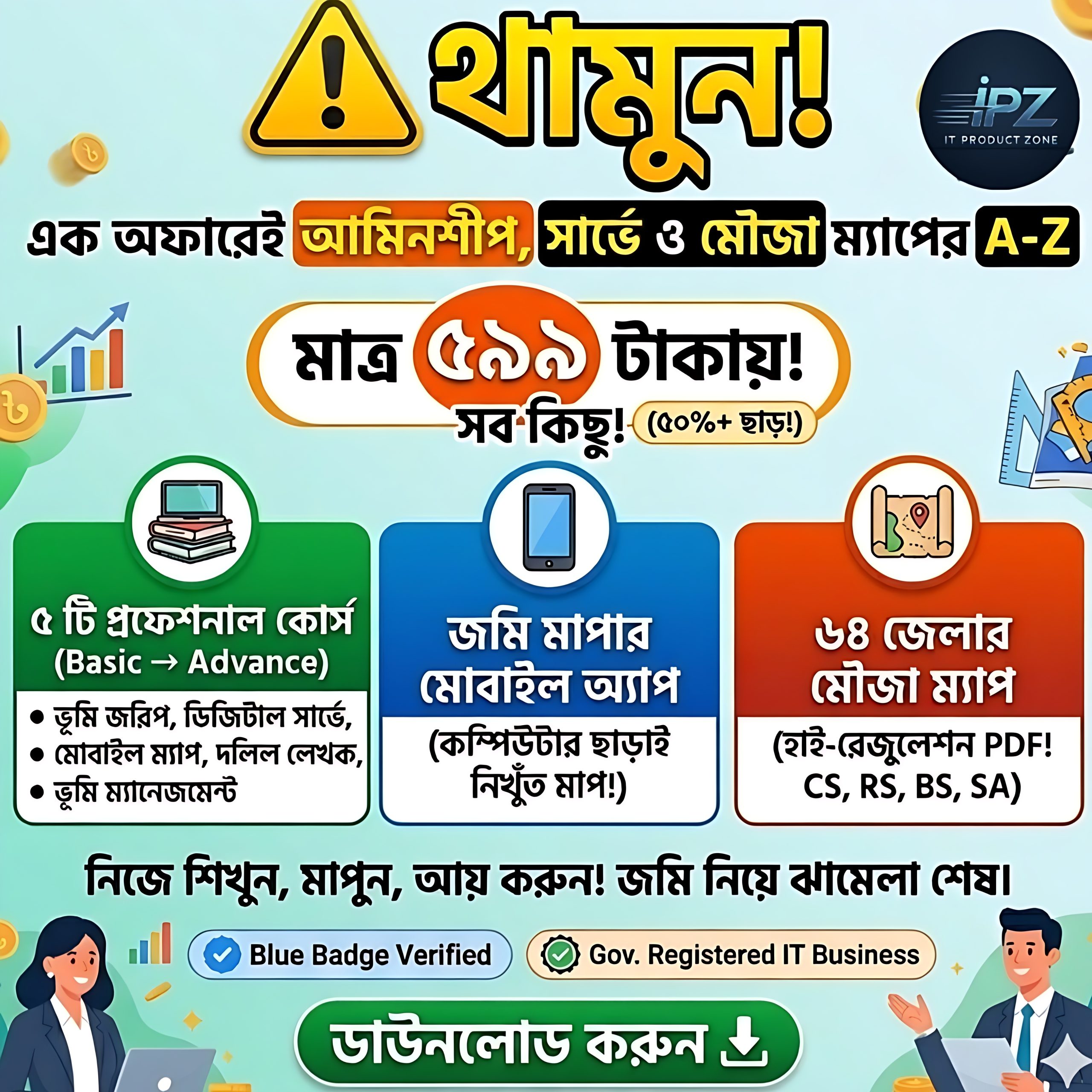 IT Product Zone নিয়ে এলো বছরের সেরা Land Survey Mega Combo Offer — যেখানে এক অফারেই পাচ্ছেন আমিনশীপ, ডিজিটাল সার্ভে, জমি মাপার অ্যাপ এবং ৬৪ জেলার মৌজা ম্যাপ।