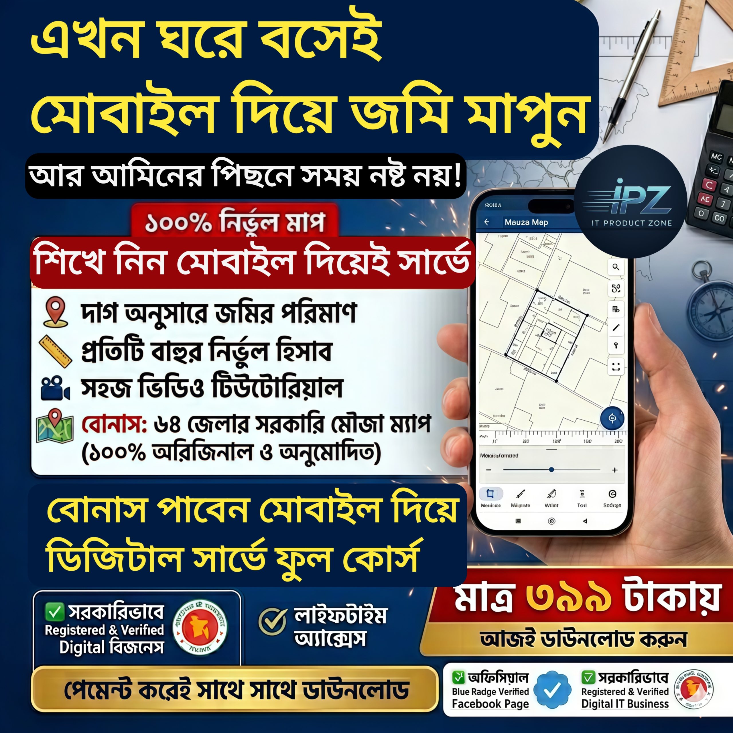 মোবাইল দিয়েই জমি মাপুন! জমি মাপার অ্যাপ + মোবাইল দিয়ে ডিজিটাল সার্ভে ফুল কোর্স + ৬৪ জেলার মৌজা ম্যাপ এখন মাত্র ৩৯৯ টাকায়!